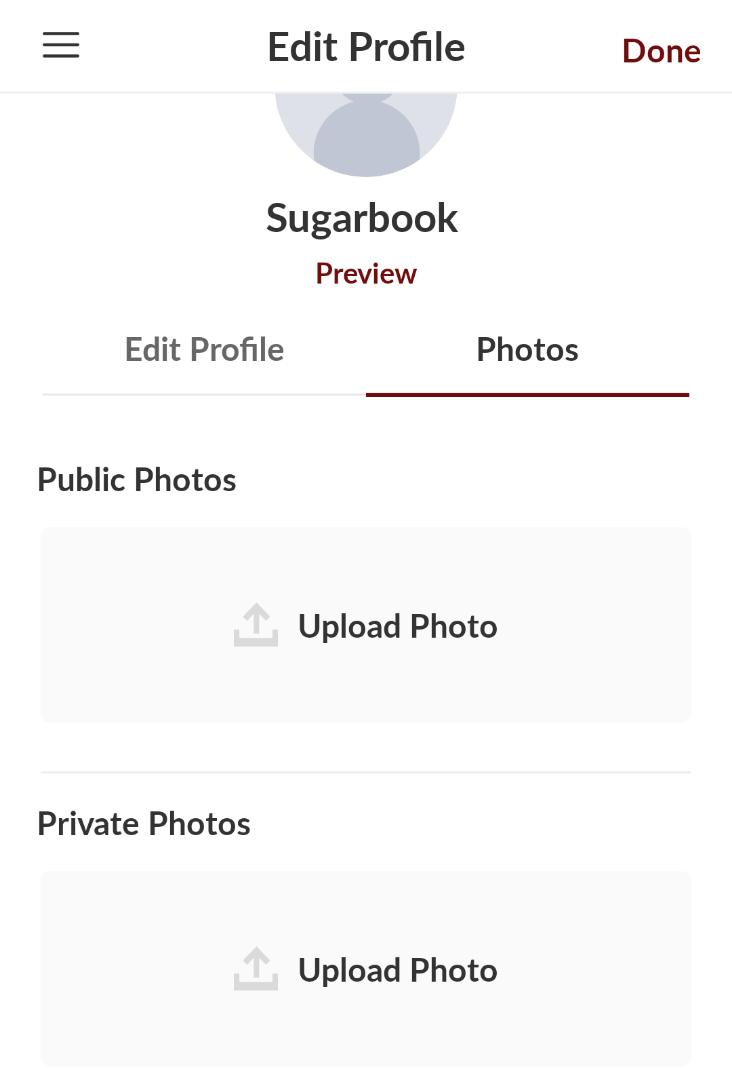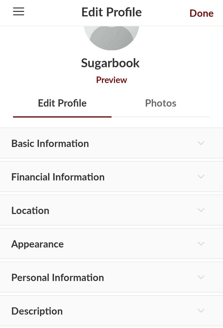 Open your Sugarbook app. Tap the menu icon (three-line icon) at the top left of the screen followed by Edit Profile. Ensure that your Basic Information, Financial Information, Location, Appearance, Personal Information, and Description, as well as Photos, are filled out.