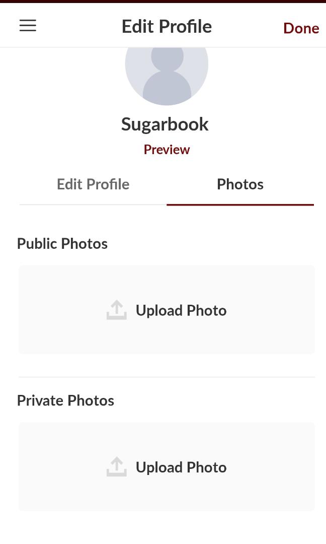 Open your Sugarbook app. Tap the menu icon (three line icon) at the top left of the screen. Tap on Edit Profile and Photos. Here you can add a maximum of six photos for public and private photos. Your uploaded photos will be In Review by our Moderator before being approved or rejected.